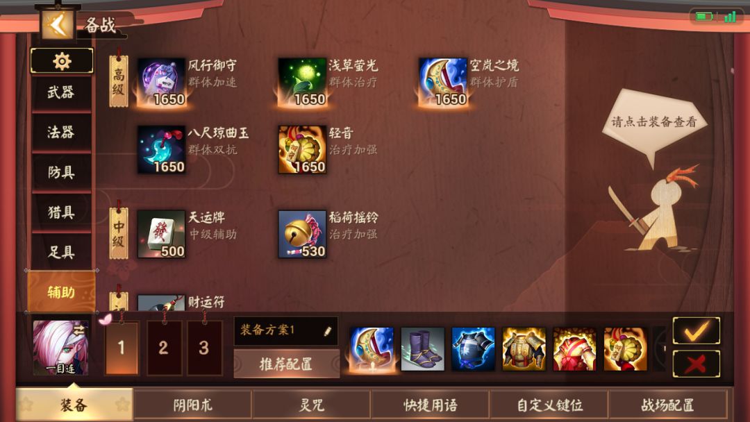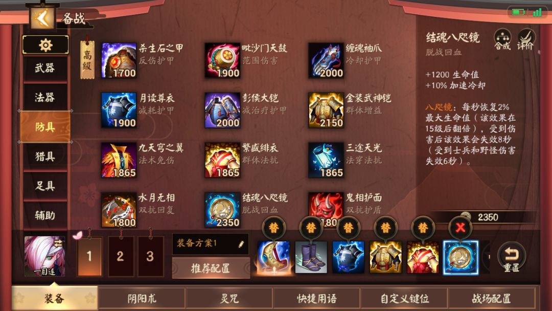 出装的话以辅助为主,可以考虑先出财运护盾【空岚之境】,然后出【踏风之履】,方便支援队友,第三件建议出【结魂八尺镜】,高速的回血大大增加生存能力,然后看对方,如果队友输出够强,可以出加法强的法器,利用被动加强队友输出,然后出两件防具 考虑物理护甲【月读尊衣】和群体法抗【繁盛绯衣】。 以下图片为参考~具体要根据对方阵容而定哦 如果对方物理输出厉害 ,可以把鞋子换成【叶隐具足】,如果对方法师厉害,可以先出【繁胜绯衣】