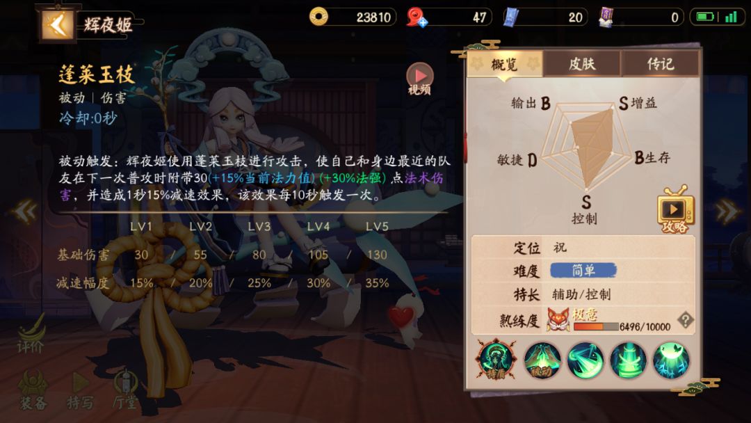 辉夜姬有两个被动技能~第一个可以增加队友的法力值,第二个具有减速效果~