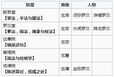 u 达摩院:玄悲方丈为玄字辈高僧,是寺内佛法和修为达到顶峰的高僧,现居住在达摩院,需出师三阶方可拜师,需闯过十八罗汉阵获取达摩令方可学习。