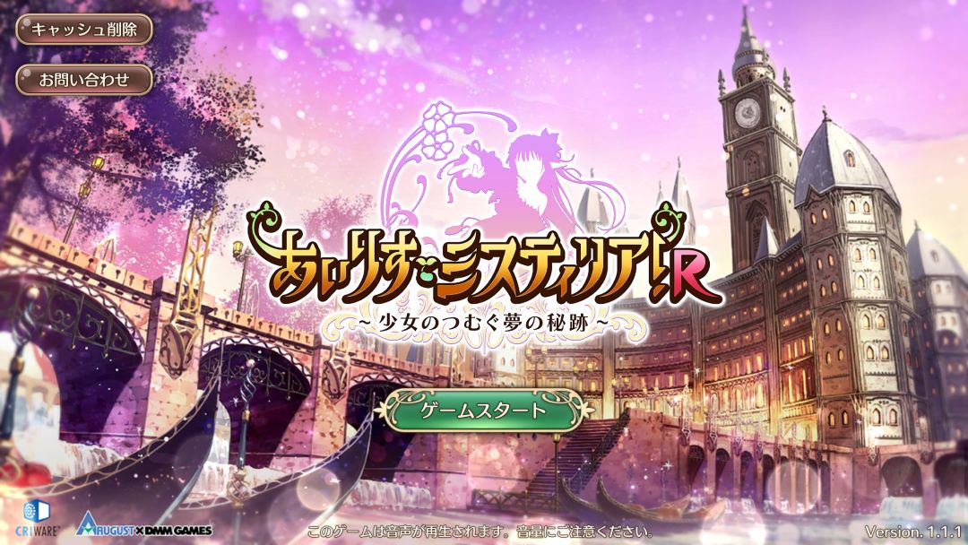 首先是游戏开始界面,游戏必须要使用日本网络工具游玩,才能进入如上页面,左上角最上方按钮是删除数据包(用来修复部分因为数据包下载出错造成的游戏问题),下方则是是联系客服,中间的按钮,自然就是开始游戏啦。