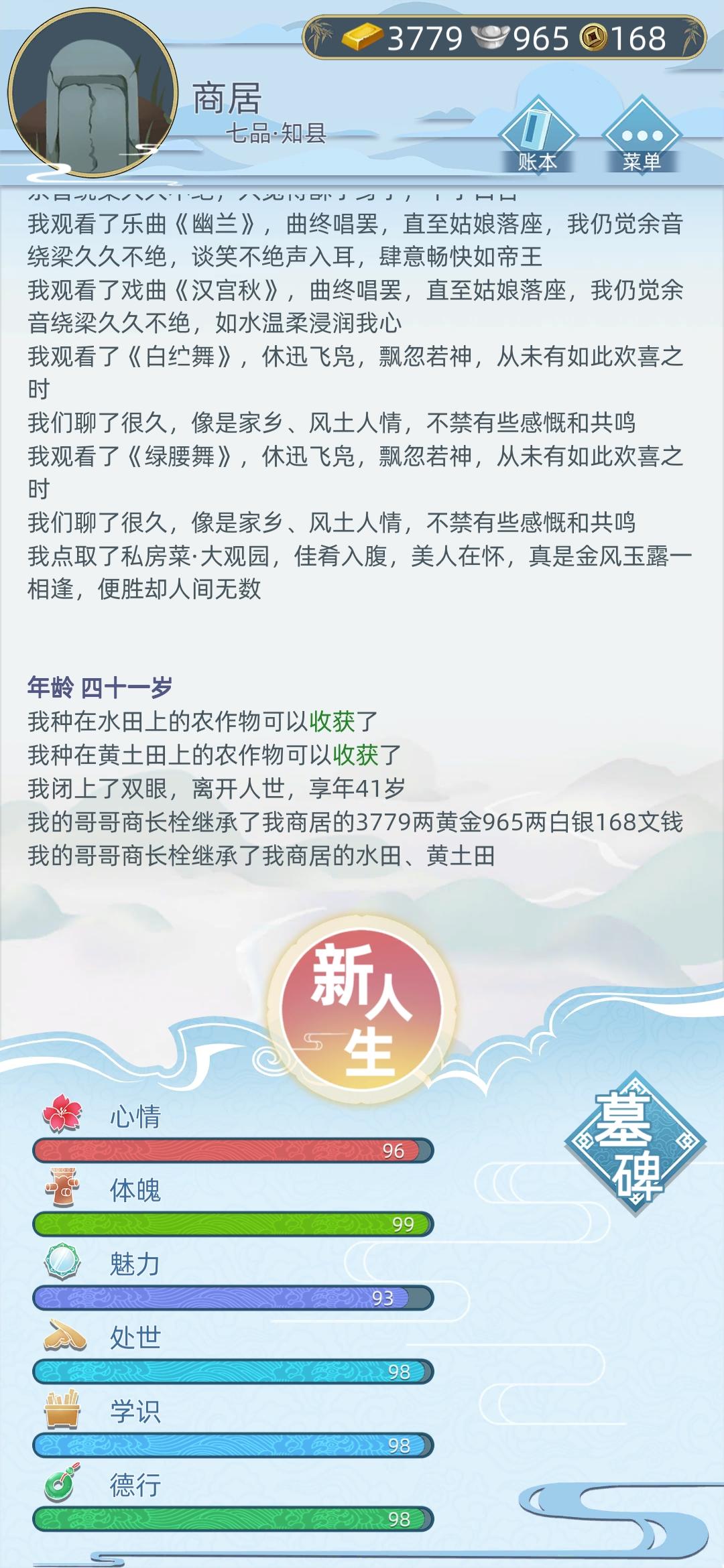 可------!GM你写的什么垃圾代码,四十一无故死亡,寿终正寝???古人寿命短也不会在四十岁寿终正寝吧!我tm媳妇差一点娶上,你让我暴毙,我的家财给谁?人世间最痛苦的事莫过于,人死了,钱没花完。