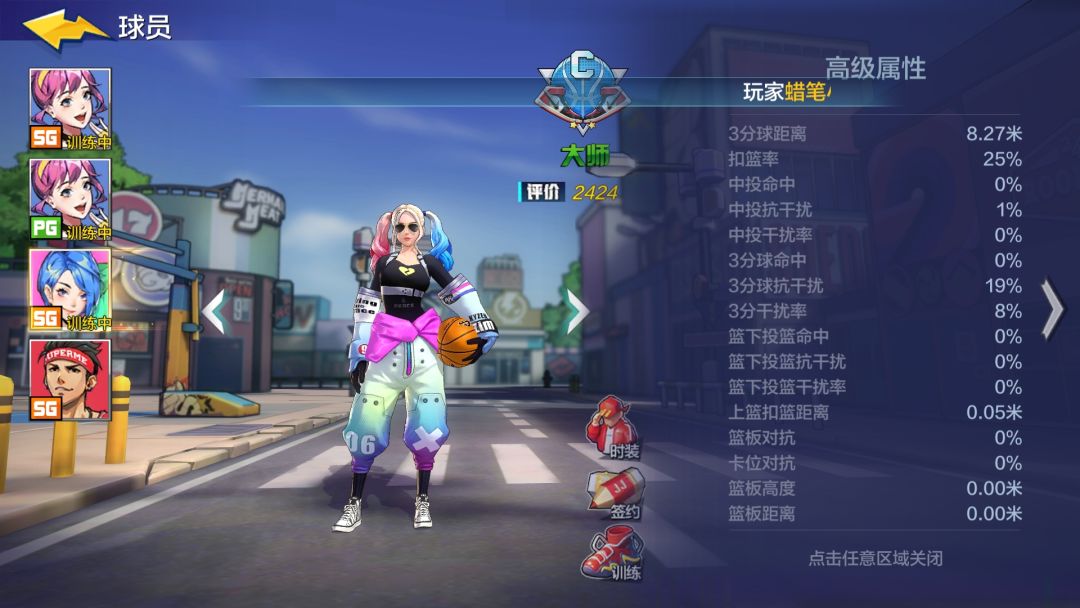 最近有很多人 总是说什么 sg顶着干扰也能进 什么篮板别人 随意推到自己的 麻烦你们 动动脑子 好吧 这个游戏不只有一个属性面板在面板右边还有一个 向左的 小箭头 点进去 自己看看自己的数据 我这里以sg举例下面放图