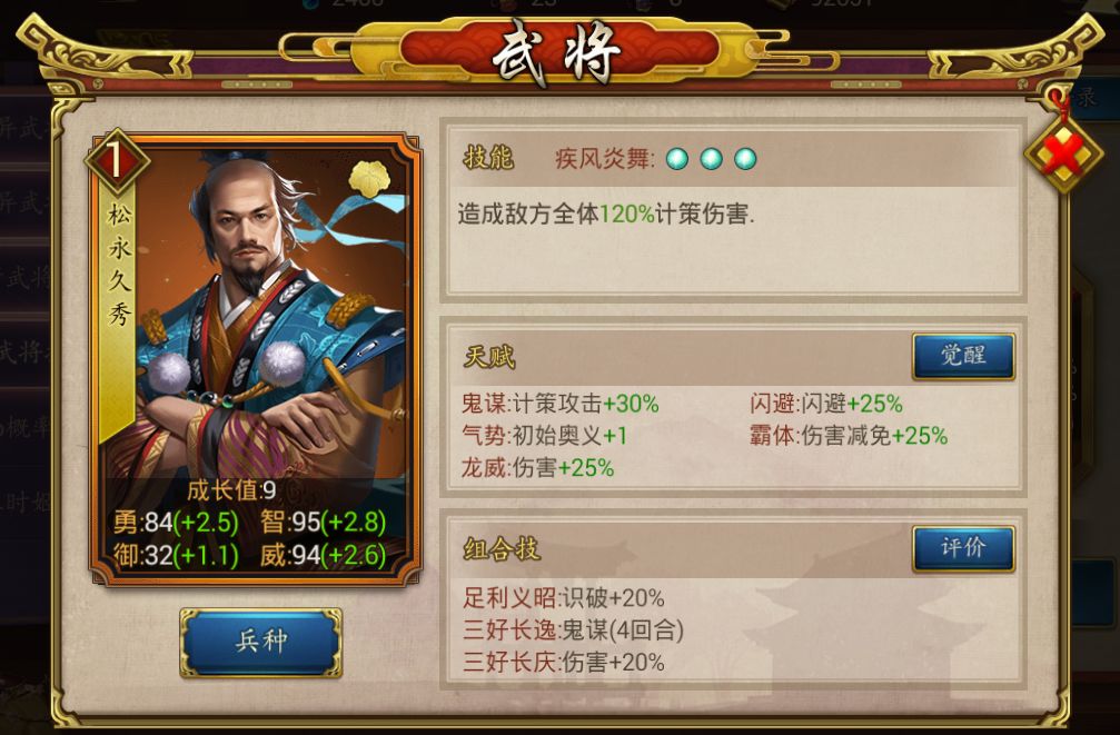 松永久秀一生虽然视“忠义”二字如无物,但是他的智略还是相当了得。不然也不至于到了第二次反叛信长,信长还试图安抚。同样的,在策略竞技手游《战国布武》里,松永久秀仍然是一个智略十分了得的武将。他的技能“疾风炎舞”能给敌方全体带来巨额的计策伤害。