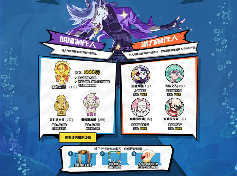 综合得分最高的角色,将摘得“C位出道奖”,赢取6666元奖金,且该角色将优先植入游戏,英雄上线后,制作人和粉丝团还能免费获得该英雄!综合打分2-5名中,实力值占比高的2位将获得“实力派出道奖”,偶像值占比高的2位则获得“偶像派出道奖”,奖金各2333元,角色也将植入游戏!
