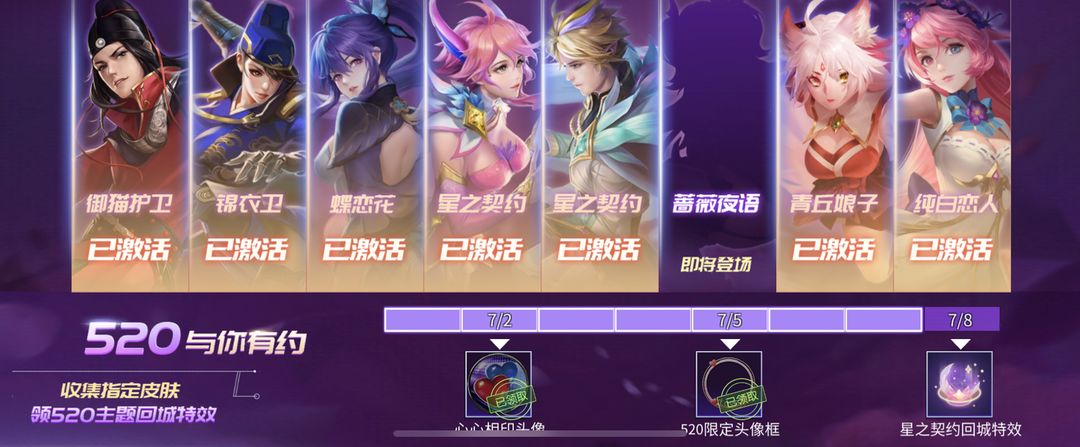 9. 集皮肤得特效:5月27日-6月9日,收集指定皮肤可得星之契约回城特效、520限定头像框、心心相印头像;