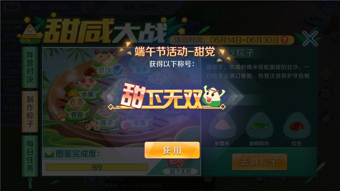在“甜咸大战”的活动任务中,都是非常简单就可以完成的,在游戏中可以获得很多包粽子的原材料,通过不断地试验包粽子的配方,我终于集齐了九种粽子图鉴,当然啦,这里边数量最多的要算“黑暗粽子”了,很多配方错误的粽子就是黑暗粽子,还好游戏里送的原材料比较多,随时随地就能获得原料,不然我这个图鉴不知道要猴年马月才能集齐啦!集齐图鉴后我领取了礼包,获得了“甜下无双”的称号,因此我又多了个称号,还真不赖!