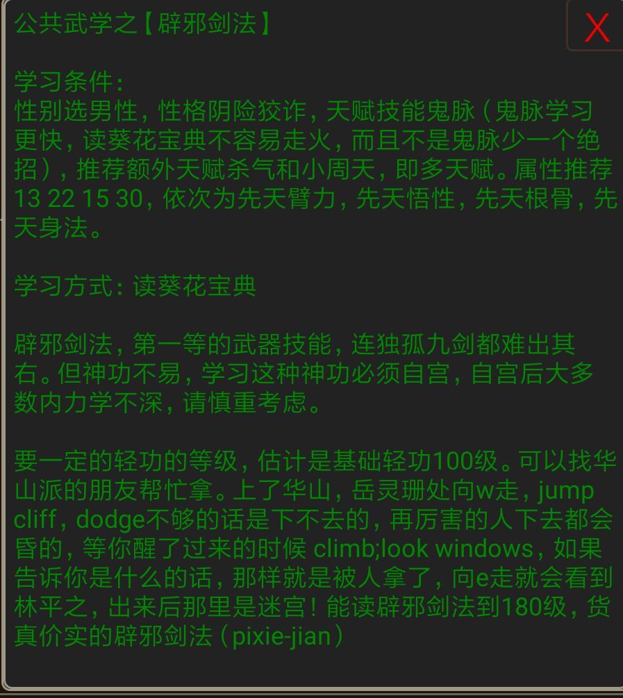 初入江湖的你一定在为玩什么武功而苦恼,是修炼勇猛的降龙十八掌还是飘逸的六脉神剑,但是这两个武功要学到却不是那么简单,而且学会之后也不一定很厉害,有这么一个武功,入门极简单,极强,完败无数顶尖武功,这个武功就是……辟邪剑法!吾辈武者当追求大道,要这**有何用![[嗒啦啦2_哈哈]](https://img-tc.tapimg.com/market/images/1bbca193685a619674d8260ad0ed7455.gif)