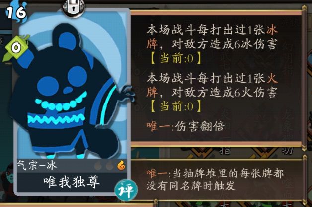 评价:首先我先球球大家别再把游侠的“唯我独醒”叫成“唯我独尊”了好么,这张卡都快哭了。强度上来说,这张卡需要配合特定套路才强,比如配合幻阴指的伤害爆炸,两张卡都三星再触发唯一效果的话,可以把真气转化为五倍伤害,不过如果boss按1000血计算,要把他打死需要216真气,要叠这么多真气的话重复的真气卡肯定少不了,不一定能保证每次都触发唯一效果。更高级一点就是气宗无限流,不断刷牌利用这张卡输出,不过这属于大佬的杂技,新手不一定能用。这张卡的其它套路我就是不太清楚了(如果有大佬知道可以补充一下),所以泛用性相对比较差。
