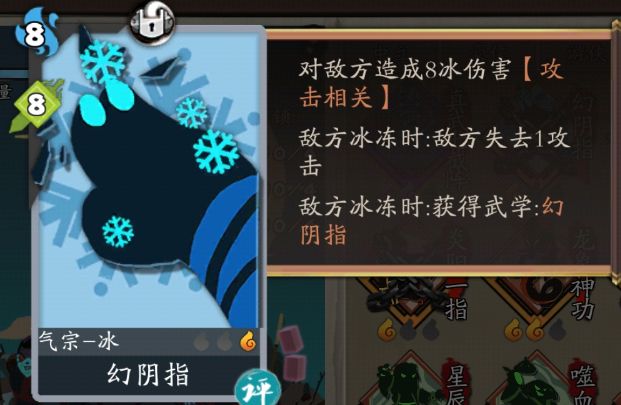 评价:这张卡的分数我可能给得偏高了一点,主要是这张卡在很多特定场合都表现得很好。看一下真气的伤害转化率,在敌方有冰冻的条件,一星的幻阴指可以把全部真气转化成相同的输出,而三星则是把全部真气转化为两倍输出,与升级后的六绝剑气相比,效率是它的一半,而伤害是相同的(区别只是六绝可以省下一半的真气),因此就算仅考虑伤害,这张卡的强度也是不错的,毕竟如果能把对手秒了,剩不剩下一半真气也无所谓。