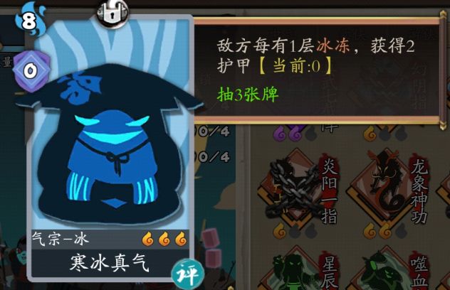 评价:一星和三星的差距较大,一星无法过牌(一换一),作用主要在于冰火流里叠叠护甲,如果是冰流的话,不论是推图还是历练我都建议拿一到两张,轻松几百上千点护甲,可以用来以防万一,不过如果不是冰火流或者是冰火流里的火流的话就别拿了。三星后强度逆天,就算不说叠盾效果,只需8点真气就能一换三的威力还用说么,不论是什么流派,看到了都要多拿几张(实际上二星开始强度就很高了)。