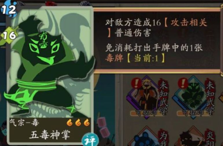 评价:毒流绝对核心,上一期少林棍法的时候就说过,有倍数叠加效果的卡都一定有用,甚至很多情况下都可以围绕他们组建一个体系,而气宗毒流的倍数卡就是这张了。多拿几张,或者用无相内功复制都行,随便乘几次后就可以感觉到指数爆炸的威力了。0.5分只是扣在泛用性上。