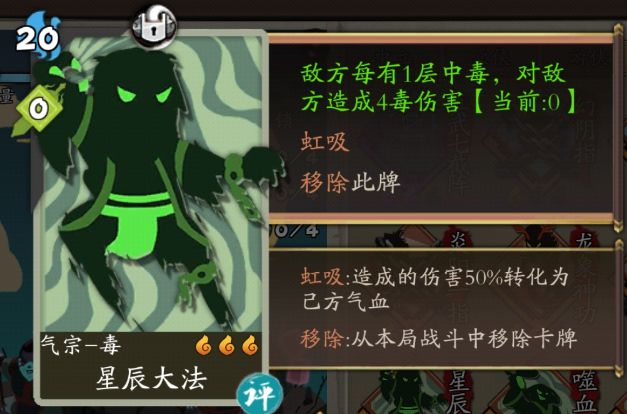 另外,从泛用性来说,这张卡也并非只能用于毒流,新手在推图续航不足时,利用魔教教主的人物技能给对方挂上几十层中毒,然后补一下真气直接用星辰大法,可以恢复一大口血,非常实用。