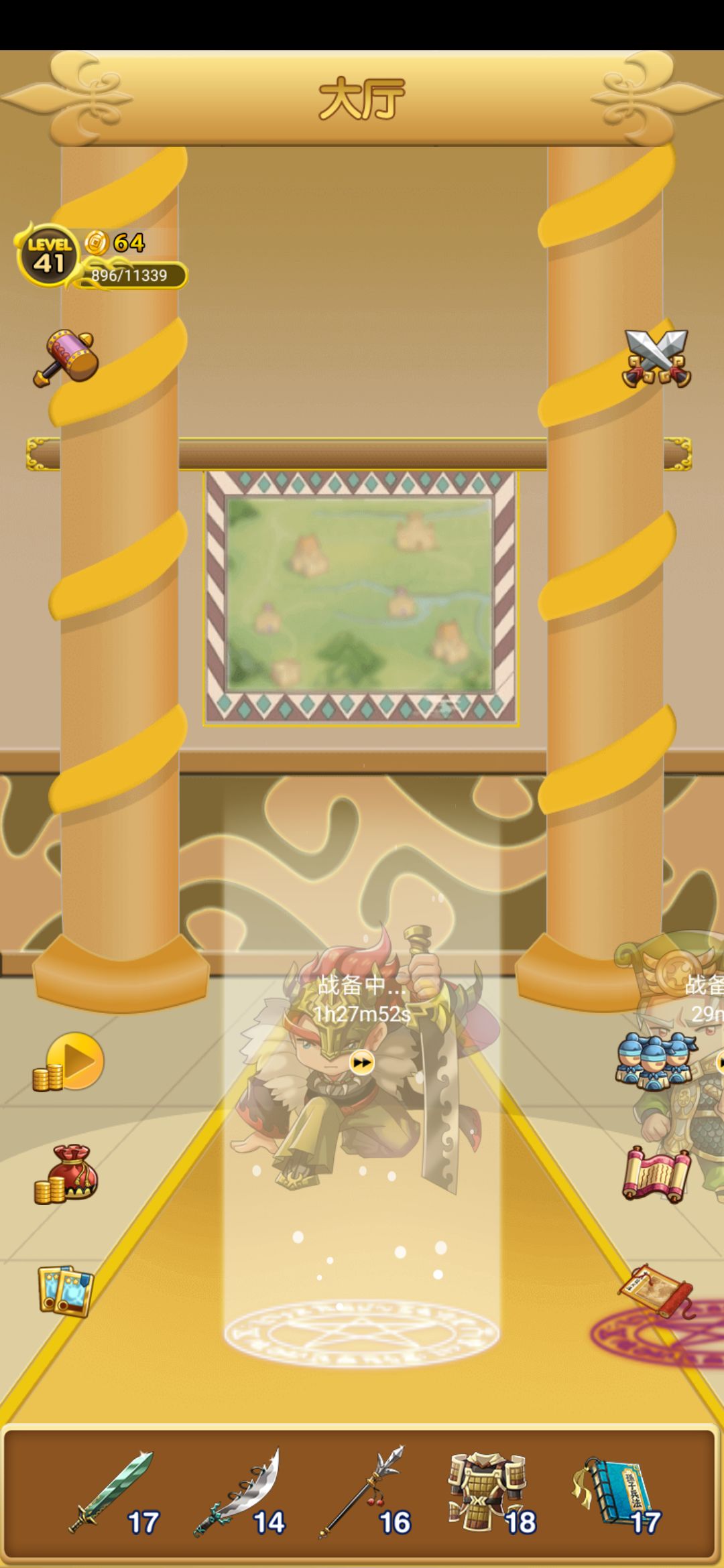 三关以后时间用的越来越多,我现在召唤个孙策要两个小时,金币来源那么少,哪里舍得加速,相比之下材料到是够用了(等召唤武将出来已经收了几波了),不用说死了,就是每张图更新武将都要用一天时间,武将死了不舍的复活,只能直接更新武将