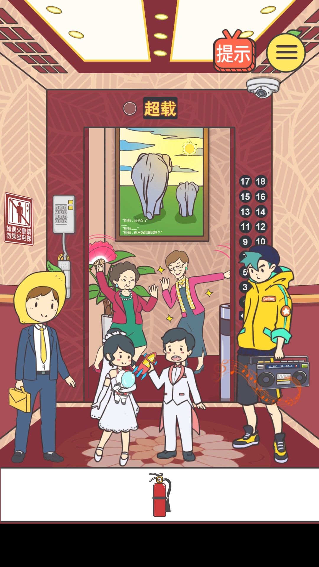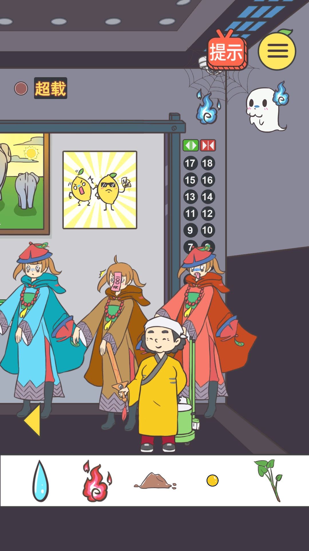 24.拿出桶内的道士服和画上的剑给保洁阿姨,收集水(画上柠檬)火(右上鬼火)土(挂画小象)木(绿色盆栽)金(男主手上),按照五行相克,从右到左分别为水,木,土,火,金。