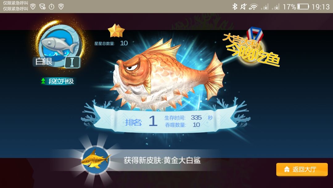 游戏很有意思,也很新,很有想法,吃鱼的玩法非常有创新,但是游戏的玩家有时候我总会怀疑是人机,或许是段位太低,遇到的都不厉害吧。到达白银段位时,游戏送了个黄金鲨的皮肤,惊喜,貌似无氧金的游戏,还送皮肤(。ò ∀ ó。)