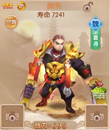 介绍: 相貌魁梧,膂力过人,擅使两枝铁戟,重八十斤。曾经为朋友报仇杀人,提着仇人首级经过闹市,数百人不敢近。为保护曹操奋战而死。由于可单手举起欲坠的旗杆,被曹操称为“古之恶来”