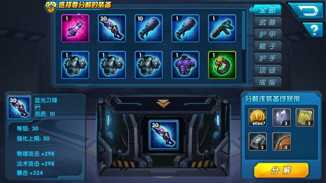 装备分解可以将背包中进行过培养的装备进行分解,分解后会获得一个初始状态的该装备,并返还部分培养该装备时消耗的金币、锻造材料、精炼材料。