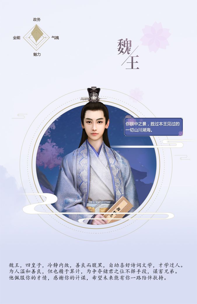 魏王,四皇子,冷静内敛,善良而腹黑,自幼喜好诗词文学,才学过人。为人温和善良,但也精于算计,为争夺储君之位不择手段,谋害兄弟。他佩服你的才情,感谢你的计谋,希望未来能有你一路陪伴扶持。