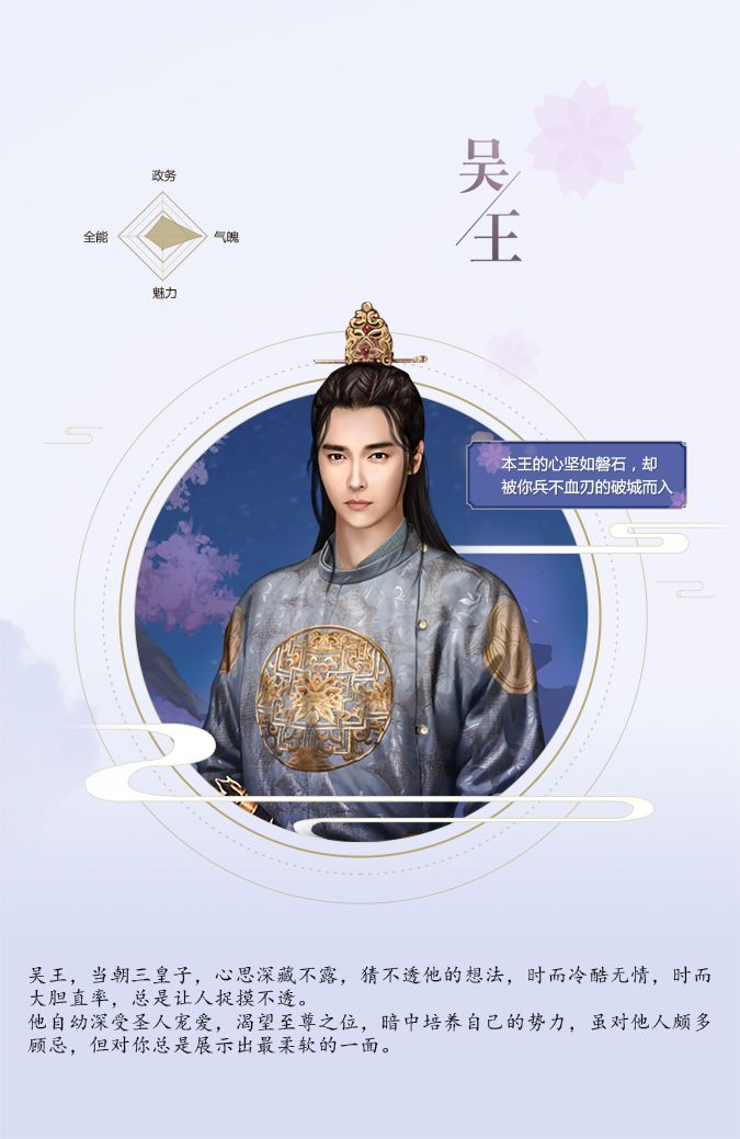 吴王,当朝三皇子,心思深藏不露,猜不透他的想法,时而冷酷无情,时而大胆直率,总是让人捉摸不透。吴王自幼深受圣人宠爱,渴望至尊之位,暗中培养自己的势力,虽对他人颇多顾忌,但对你总是展示出最柔软的一面。吴王妃们快举起你们的双手!