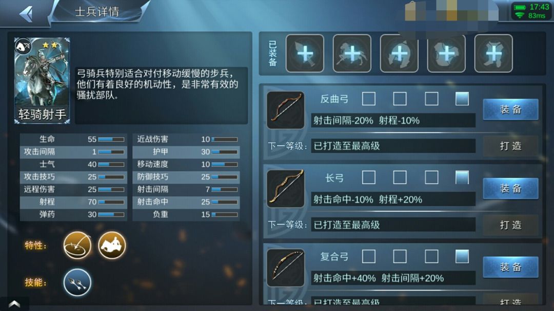 一个运气好到爆炸的军队,常常极限输出,也一次次的凭借高速与箭雨把想要逃跑的基本合格射倒入血泊中然后拉回凉州。有速度与伤害,在凉州不断的四处风筝敌军,因为常常极限输出,所以老王决定下个版本削,啊哈哈哈哈哈哈。。。。。技能:减命中率减射击间隔。