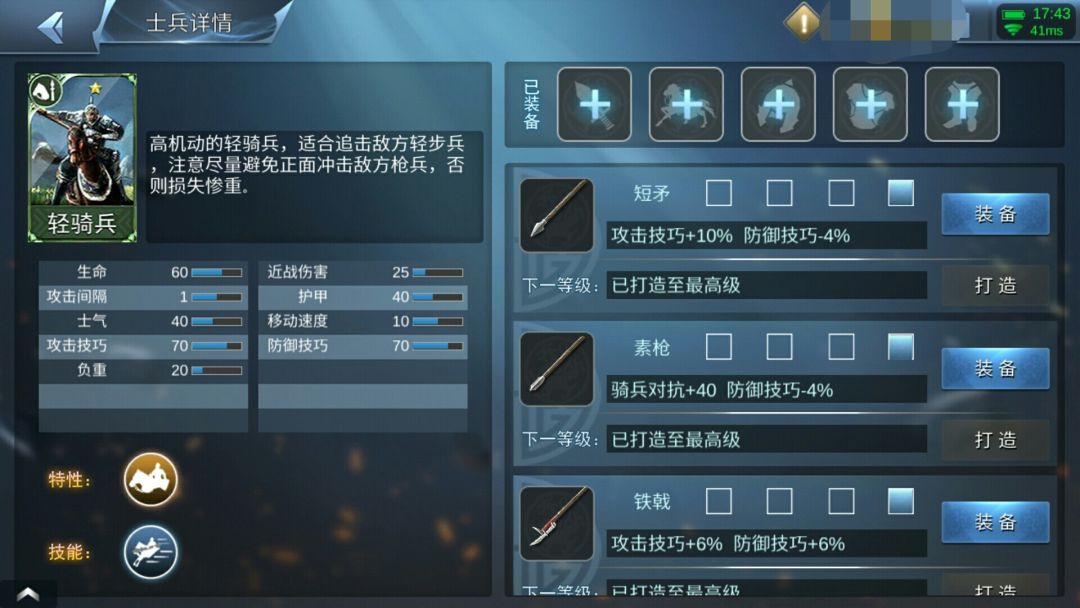 一个不小心就因为基本合格而变相被削的军队,虽然枪兵和他的亲戚加强了骑兵对抗,但是骑兵都出场率仍有90%以上,甚至有指挥者声称自己玩五骑厉害的很,骑兵凭借着高速高伤高甲几乎称霸战场,侦探、偷家、侧袭、硬刚样样骑兵都擅长,不愧是老王的干儿子,可惜只是干儿子啊。技能:加速加伤害加攻击技巧。