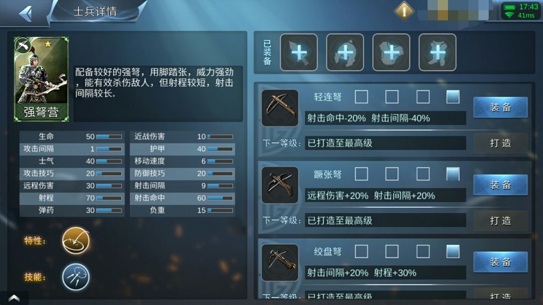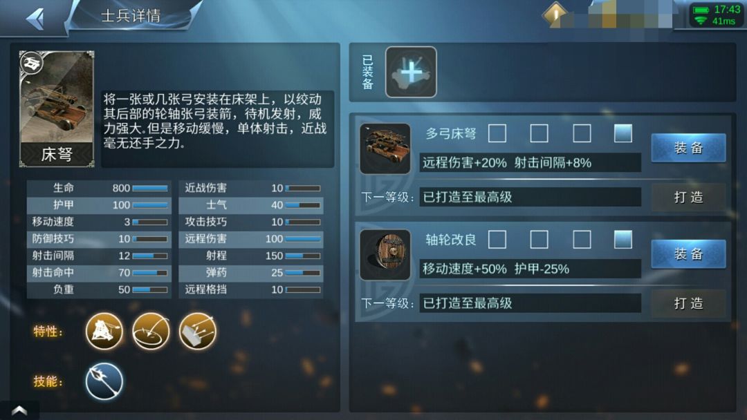 现版本第二废的军队,虽然说射的远,但也因为高超伤害而让老玩家不使用,刚开始萌新会不知情的使用,当遇到其他远程攻击军队时,就会知道什么是伤害,发现这个弓兵伤害之低,虽然射的长,但是弓骑兵速度快,不一会便可以射到弓兵,弩兵虽然速度和弓兵一样,但是被弩射一下便知道什么是一发入魂。后就会渐渐发现,伤害太低了,是远程攻击军队中伤害最低的一个,技能也没有什么用,加的伤害有时候还不如弓骑兵开技能伤害高-_-||,连电脑都很少用这个兵种,所以,老王会给其加强,当然就只是加属性,技能:加射击间隔,加伤害,箭变成火箭,然而并没有什么用又不会给军队烧伤效果。