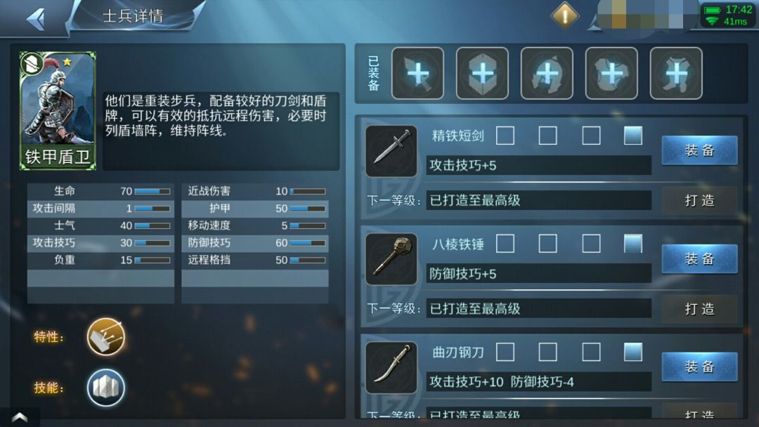 现版本最废的军队,虽然说老王给他又加血又加护甲,成为了游戏中最肉军队(除器械),但他仍以优秀的速度和猛烈的伤害让萌新用了流泪,老玩家见了沉默,只有电脑不厌其烦的时不时用一下,为此老王对键盘一顿操作猛如虎,让铁甲盾卫又得到强化,赋予其一个厉害的技能在下个版本,是什么技能呢?你们可以在评论区发表自己的想法,放心,猜对了也没有奖励。现在的技能:减速加防技(防御技巧简称)加护甲。
