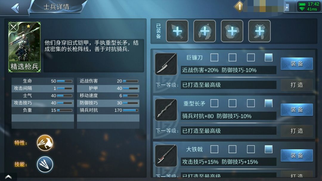 一个不小心就加强的军队。记得那天,万里无云,天气晴朗,在江陵河畔上,正在进行着一次史无前例坑骑的战斗,五骑ⅴs五枪,枪兵指挥者某某(忘了叫什么)认为这是一次必胜的战斗,高估了枪兵战斗力和低估了骑兵战斗力。再加上基本合格的脑残似的操纵骑兵,骑兵居然干翻了枪兵,且还剩六百人左右,然后基本合格脑残的去装逼,然后被那个象征着原谅色的男人——老王看见了,老王对着键盘一顿操作猛如虎,成功的爆发了十•六事件,骑兵打败枪兵成为了吃螃蟹的人。。。。。。然后枪兵加强了,骑兵对抗,枪兵的亲戚枪盾甲士也加强了骑兵对抗,而后基本合格便成为了骑兵和弓骑兵(为什么会有弓骑,因为他也骑马)的仇敌,基本合格从此消失在凉州荒漠中,直到最近我才从凉州躲避骑兵搜捕、弓骑兵的箭雨,身中几箭,苟着回来了。。。。。。技能:减速度加伤害加攻击技巧加骑兵对抗加防御技巧。