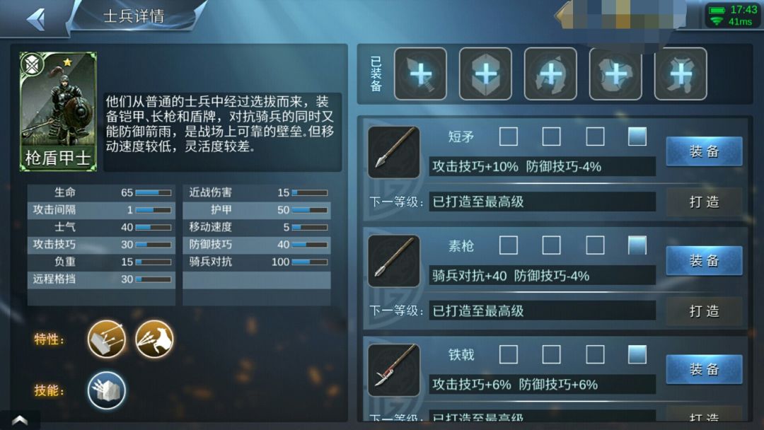 也没有什么太大变化的军队,拥有铁甲盾卫的肉与枪兵的骑兵对抗,但肉没有铁甲盾卫那么肉,骑兵对抗没有枪兵那么高,速度倒是和铁甲盾卫一样,伤害比他又高一些,且有骑兵对抗,所以出场率比铁甲盾卫好的多,一般用来防守。作为两个军队的结合品,两个军队只要其中改动,那枪盾甲士便也会改,但是因为速度慢,虽然骑兵怕,但是遇到刀斧兵就差不多凉了。技能:减速度加骑兵对抗加防御技巧加攻击技巧。
