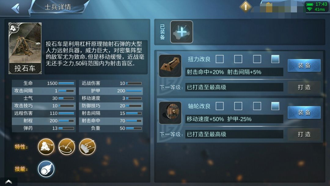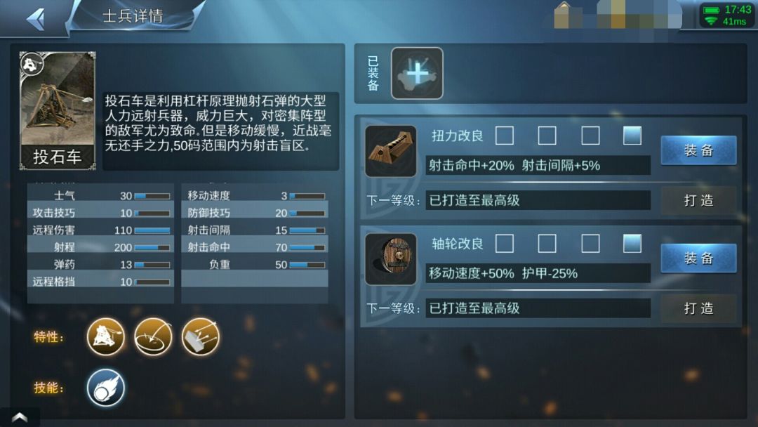 投石车,没什么太大改动的军队。当初,投石车比床弩弱时,投石车便去找老王,说:“老王老王,床弩太厉害了,大家都去玩他,不来玩我!”这件事情为后面震惊王朝玩家的十•六事件作为拿螃蟹者,成功的玩垮了床弩,但是投石车自己也不算有太大优势,只是比床弩射的远一些,伤害高一点点,且投石车有盲区,1Ⅴ1地图小,投石车才一发,机动性好的军队就已经到投石车旁边可以欺负投石车了,就只要3Ⅴ3和攻城战可以用一用。技能:和床弩一模一样。 对了,床弩少显示了一个数据,攻击间隔,所以投石车数据有一页多一点点。