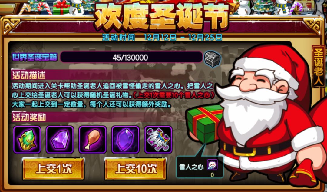 活动形式:提交雪人之心获取随机奖励,累计一定数量获取世界宝箱。
