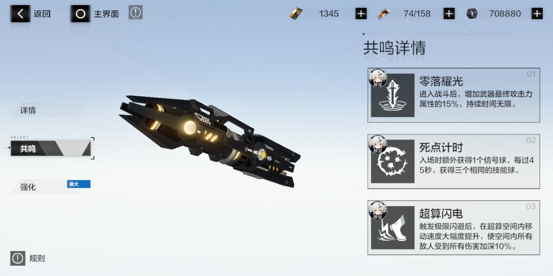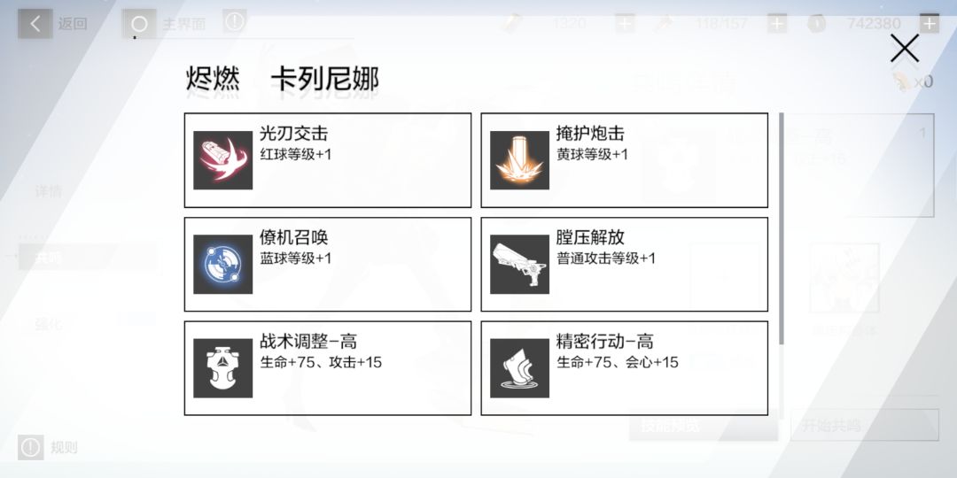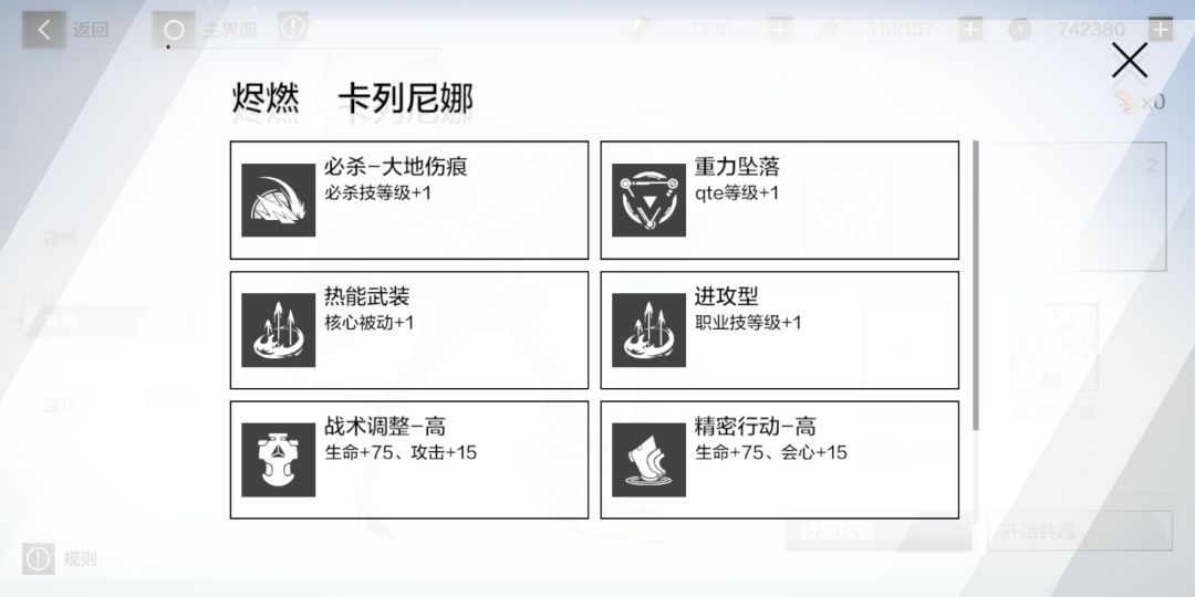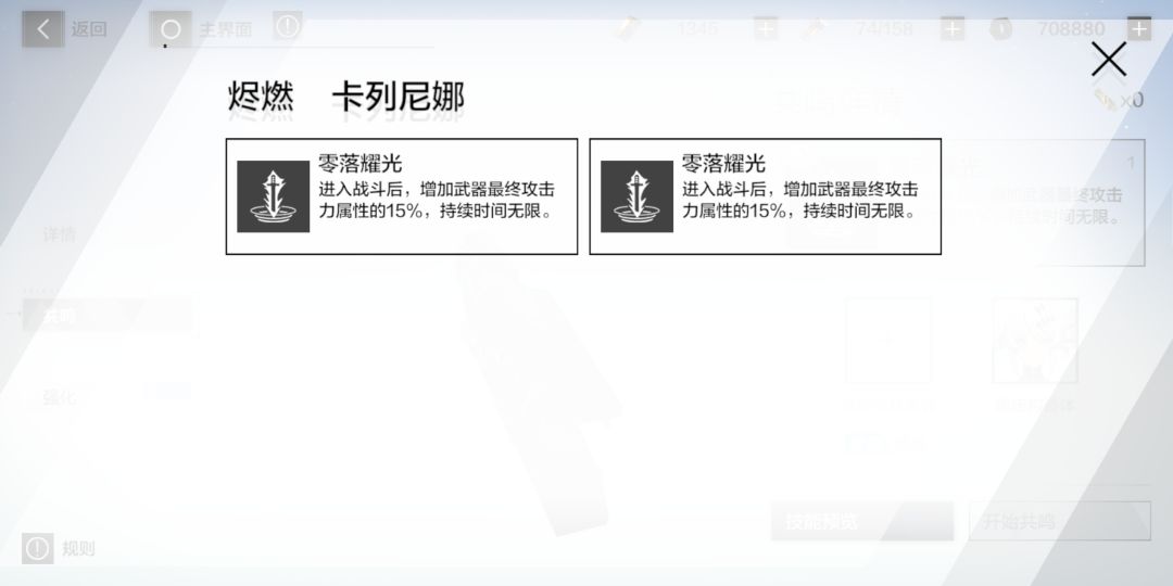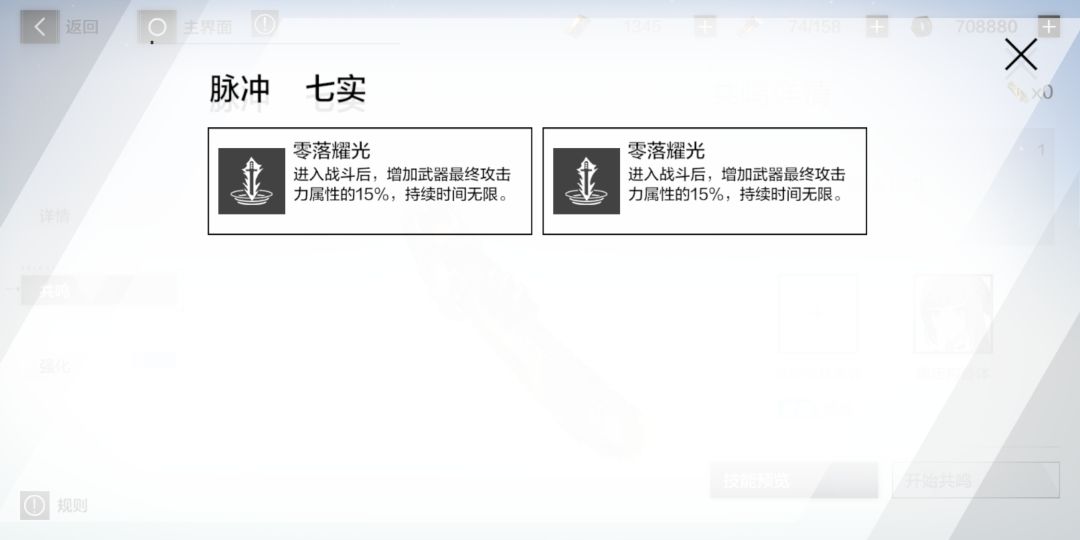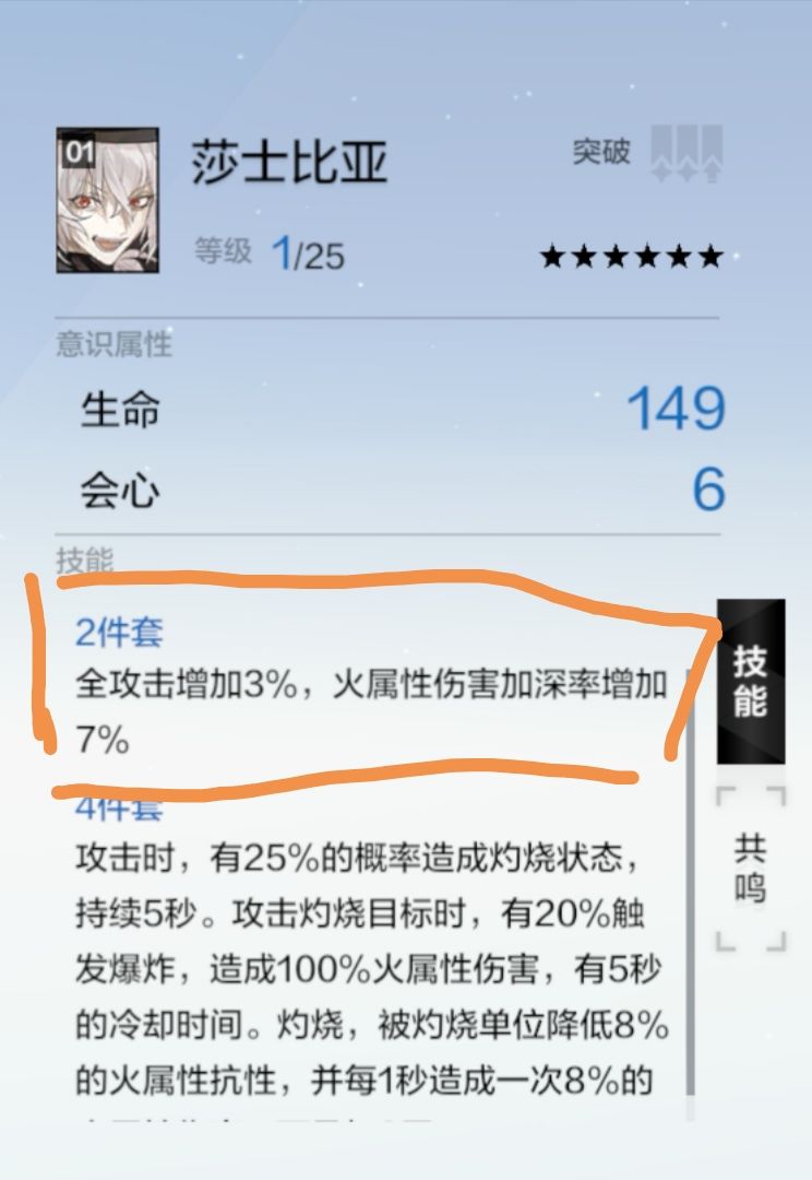 武器及意识共鸣简单来说共鸣就是给你的武器和意识增加几个被动效果。1.武器武器共鸣条件,相同星级武器一个,一个武器最多三个共鸣技能。武器共鸣技能是固定的,相比内测随机技能的时候,使游戏少了个氪金点,挺不错的。我的红龙三共鸣之后,神威的六星武器去共鸣了红龙的三槽,发现依旧是一样的技能。给图作参考,先是烬燃