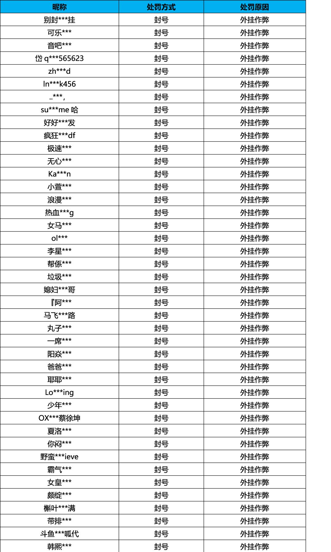 巡查发现并核实,以下玩家存在违规行为,现公布处罚名单: