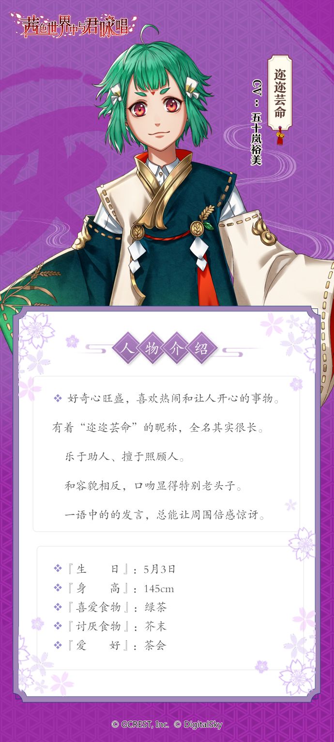 不过,虽然外表看上去是一个活泼少年,但说话的语气却像个老头子一样,稍微让人有点意想不到呢。喜欢喝茶的迩迩芸命,会在与你一同品茗之时,告诉你怎样新鲜未闻的故事呢?