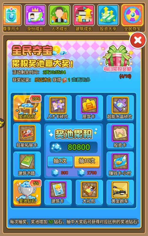 还有像完成每日活跃度100的任务可以拿抽奖券!小助理也超级喜欢在星运抽奖里搏一搏欧气的!还差一张人才卡我就可以把baby带回家了!