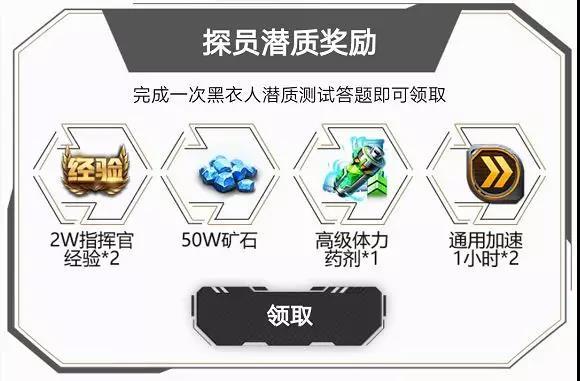 来到活动界面后,点击页面中的“START”按钮就可进入黑衣人测试!完成一次黑衣人潜质测试就可领取奖励~