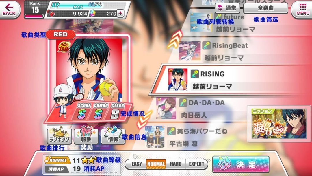 比赛结果根据歌曲内容,可以获得经验值、金币、道具等。