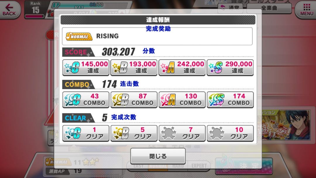 第一次达成各歌曲不同难度所设定的目标后,可以获得奖励。