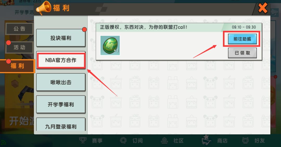 点击 公告 —— 福利 —— NBA官方合作,为喜爱的联盟打call!助力赢积分,大量奖励免费换。