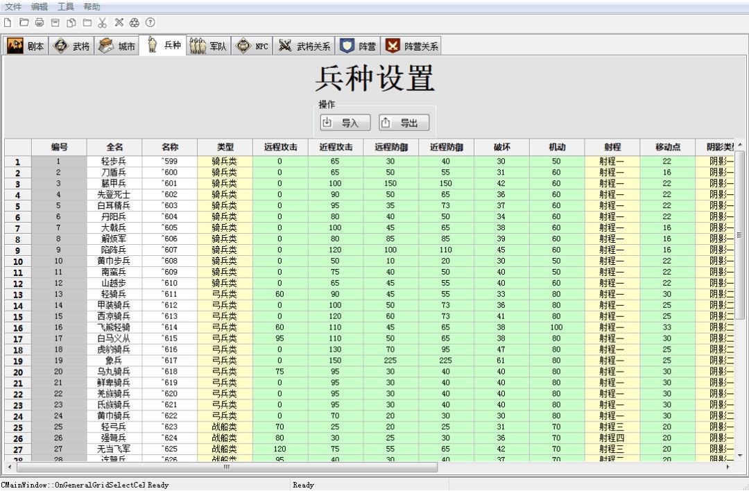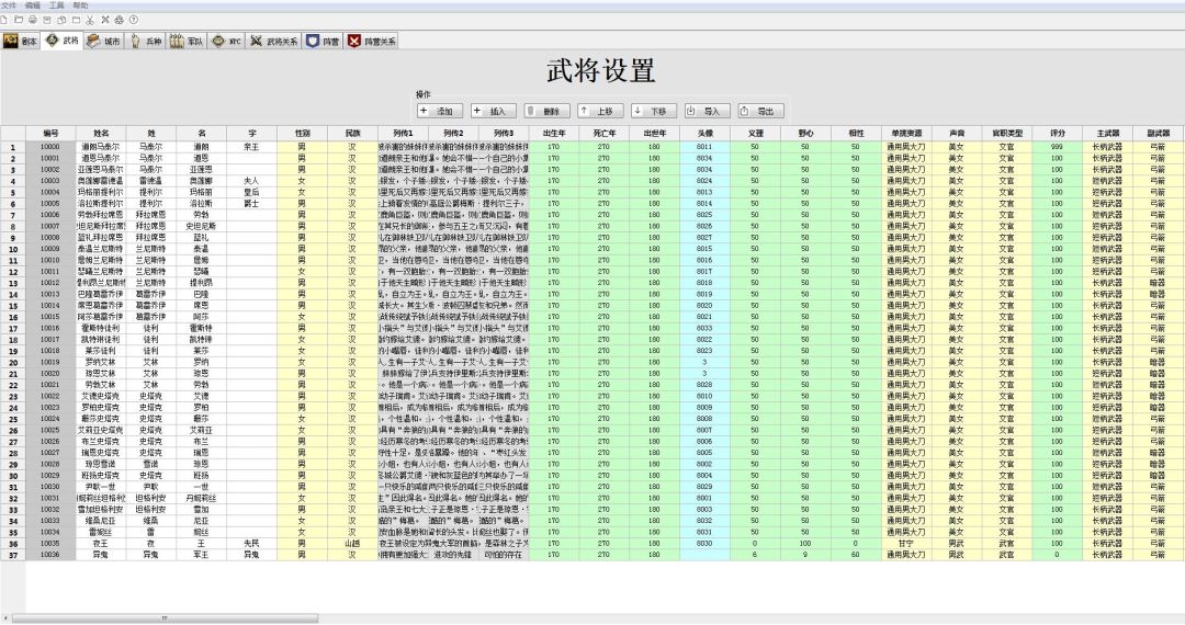 2:基本常识:一款简单易用,方便高效的编辑器,肯定是用WIN程序来制作最方便快速。(特别是能方便快速的导入EXCEL表格,这是必需的),工作平台必须是在WIN上面,有鼠标配合,才能最高效的完成各种编辑工作。在手机上无论IOS还是安卓,大家最多都是可以浏览表格,而不是在上面操作,因为手指的精准程度和方便快速是无法和鼠标媲美的,更加不要说底层逻辑语言的支持了。【举例:大家请看下面的第二张图,编辑器里面的武将设定,横向是单个武将的详细数据。一共88个填写项目。竖向是全部武将数量,我们汉末是1300个。你做一个MOD,近60个城市,你起码要配置500个武将吧?那么就是要填写88*500=44000个项目,你自己说你如果用手机来玩,你手指会不会磨平?哈哈!】