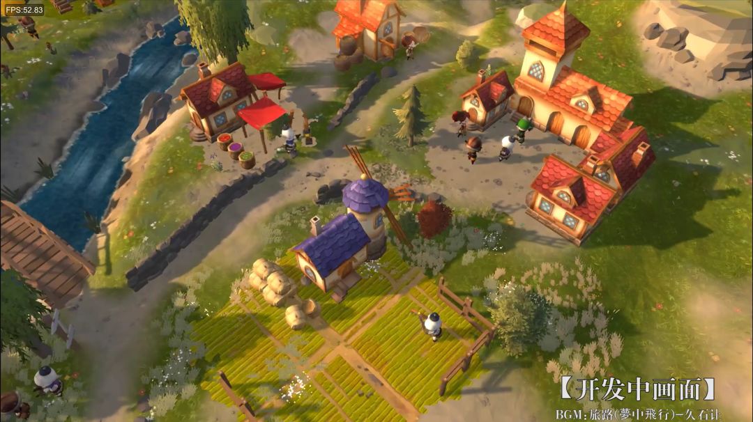 00:15-00:18,城镇的俯瞰视角,大哥偷懒只造了几种建筑,我能辨认出的是农庄,染坊,市政厅,还有个小小的房子是旅人的居所。所有建筑是动态的,比如农庄里风车会转,当然地里种的农作物也会慢慢成长到收割,只不过视频这点时间不够长熟。