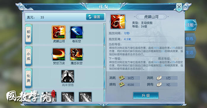 技能:呼啸山河。释放后对身边的敌方单位造成伤害并有几率触发嘲讽效果。