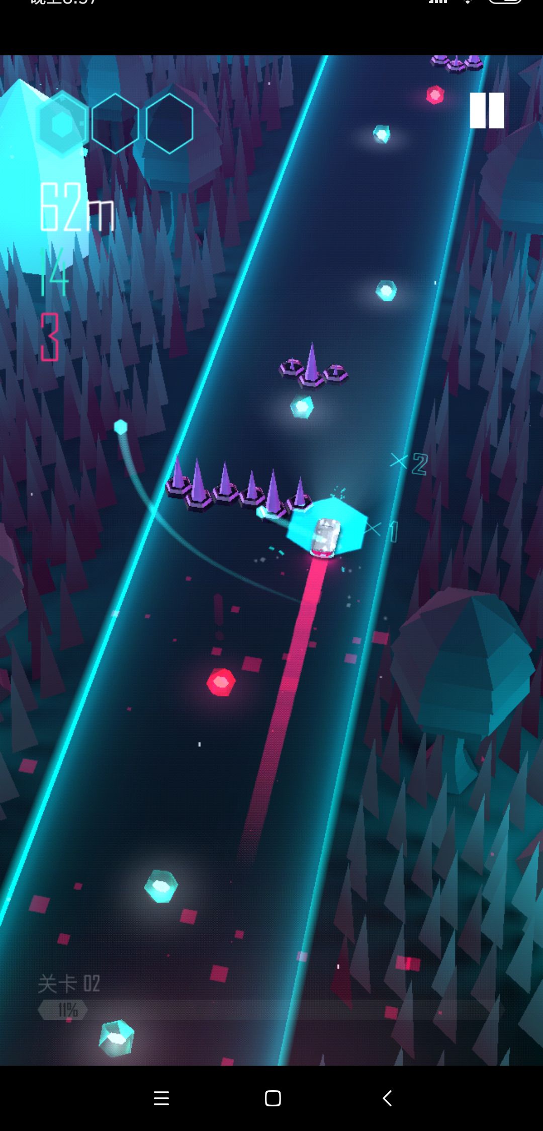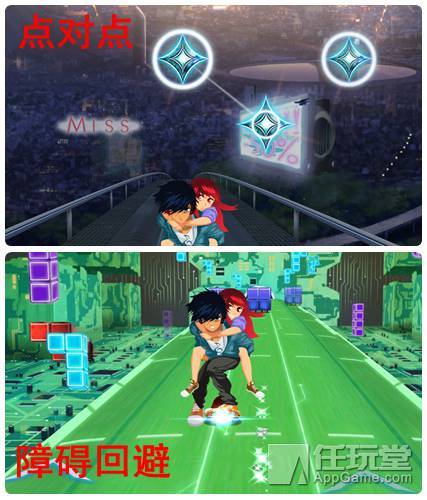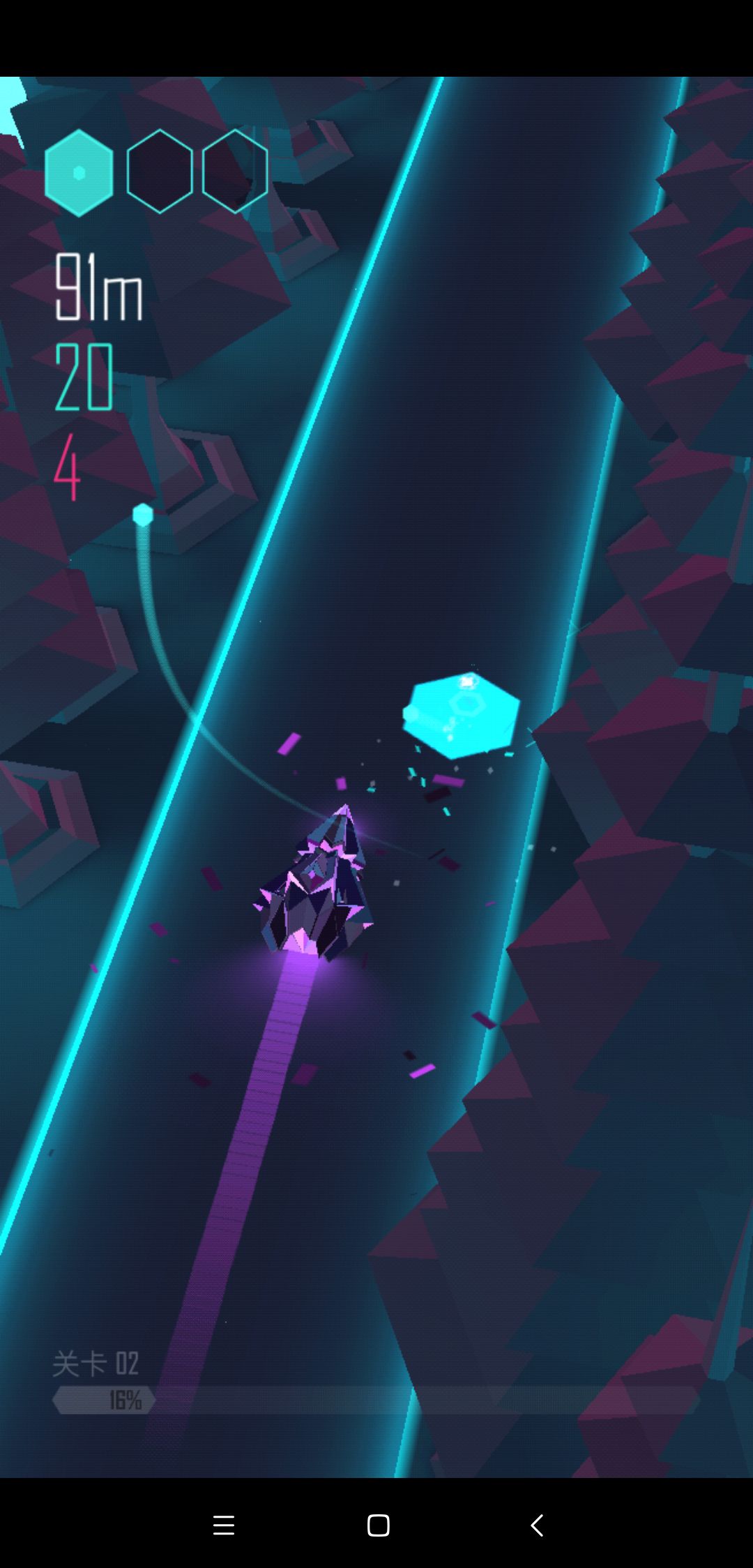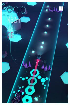 游戏是2.5d的竖屏画面,背景以黑色为主,道路两侧是棱角分明的景物,从森林到城市,处处充斥着未来感。游戏一大亮点是不仅仅只是单纯的随着音乐节奏触摸屏幕,移动方向,同时还需要通过不间断的捡路上的晶石积蓄能量,瞄准后方追击上来的敌人给予击退,延缓敌人的脚步,一旦失误太多,就会被赶上然后碾压