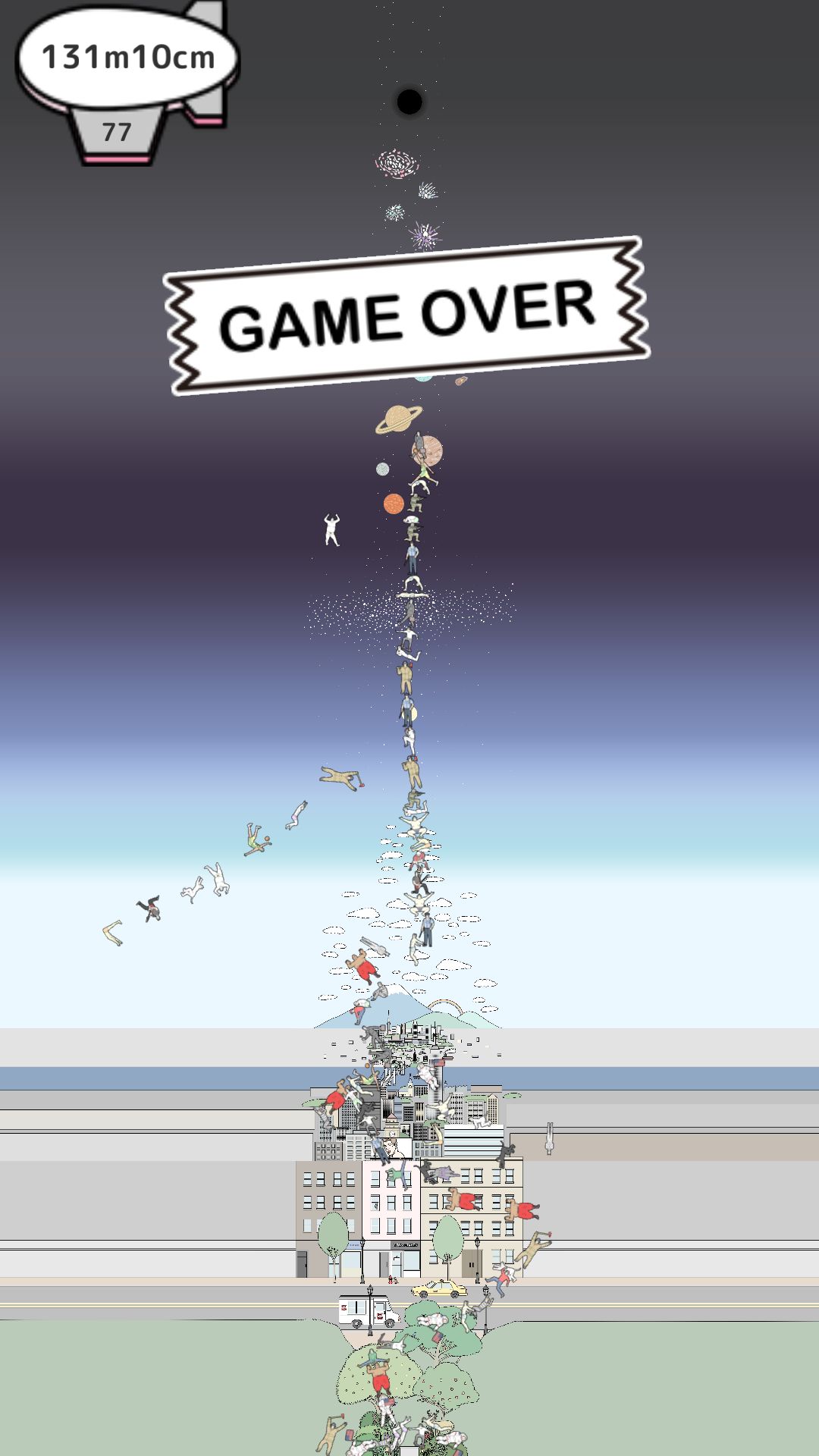 131m.10cm喔!发现里面声音特别鬼畜了,哈哈哈哈,还有些人物……🌚跟你们分享一下,其实旁边那些鸟啊,幽灵啊,还有飞碟,火球什么的,那些你点击一下他们就会被你弹飞啦。其实我也是刚发现,所以就有了个新纪录。hhh.