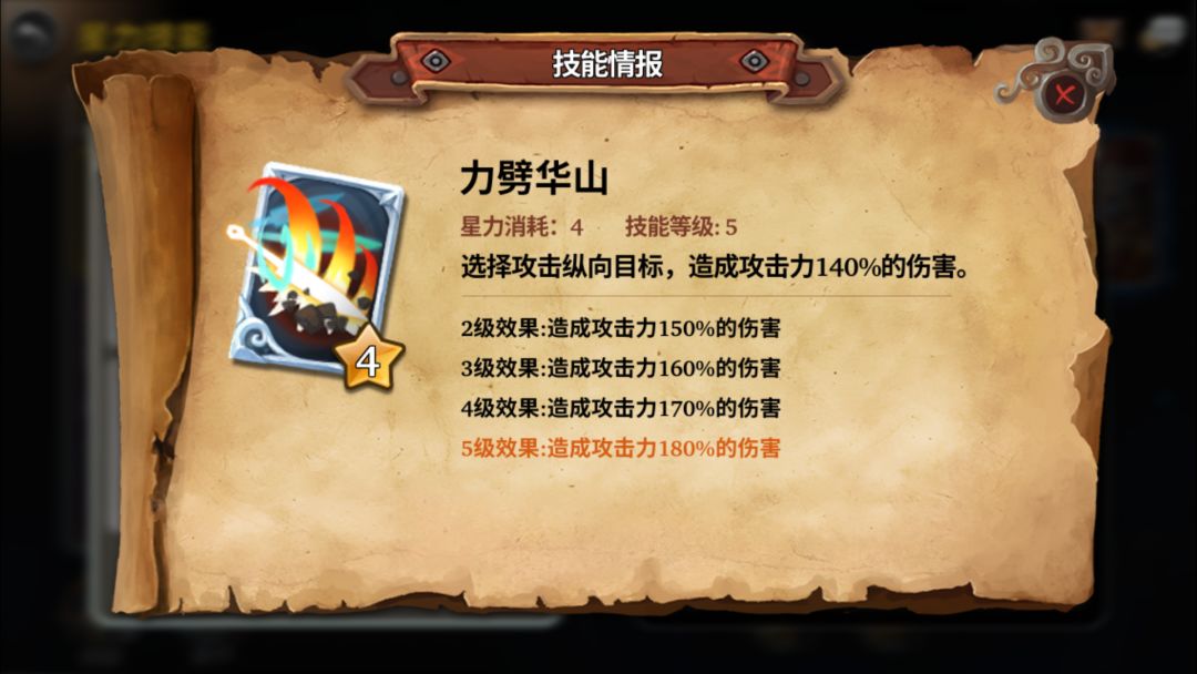 力劈华山:4费纵向攻击技能,对于敌方后排可以起到伤害作用(通常脆皮放后排)破坏阵型,输出敌方脆弱单位,打开局面必备。重要程度:⭐⭐⭐⭐⭐