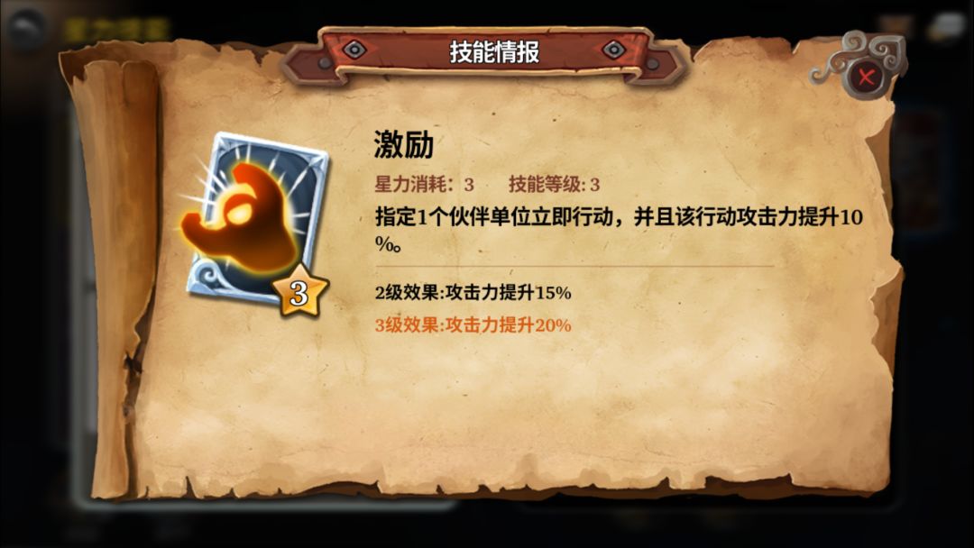 激励:快速出手的buff技能。在局面中我们会常遇到需要一个英雄的技能释放在合适的时机的困境,激励就是这么一个让己方能够快速出手打出伤害或者治疗的技能,在激励状态下的角色有攻击力加成,伤害更高,治疗更足。重要程度:⭐⭐⭐⭐