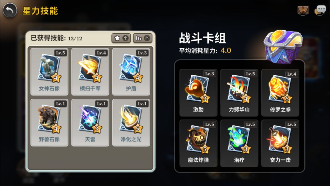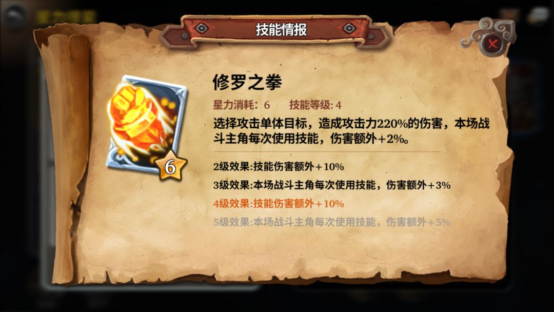修罗拳,修罗拳,修罗拳重要的东西说三遍,6费的修罗拳注定了一场战斗中技能覆盖率低,但是极其变态的单体输出和成长伤害能力(星之子每使用一次任意技能就能增加修罗拳的伤害)成为了改变战局和翻盘的关键技能。落后了?相持了?来发修罗拳吧!给你惊喜,让他绝望。重要程度:因人而异!