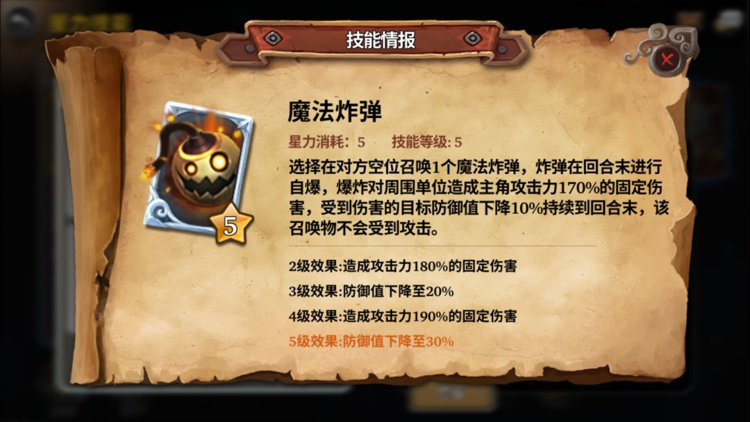 魔法炸弹:5费炸弹的机制有点特殊,回合末爆炸,爆炸伤害是9宫范围,伤害没有暴击,不能抵抗,无视反击(护盾可以抵消)爆炸后被炸弹炸到的角色会有防御减弱的debuff,这个时候配合攻击技能能打出更高的伤害。炸弹的技能覆盖面广,伤害高,对于敌方的残血英雄是极大的威胁,因为要保护英雄,敌方通常要治疗残血范单位,爆炸后出现新的残血单位就是你的新的攻击目标,要灵活使用哦!重要程度:⭐⭐⭐⭐