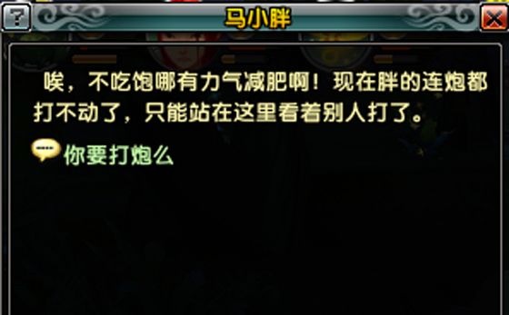 任务的背景是找到一个NPC接任务,那个NPC会请玩家去帮助马小胖。等玩家找到马小胖,马小胖会说:“唉…我太胖啦,连炮都打不动了,你能帮我么?”然后玩家就要点击:“我来帮你打炮……”