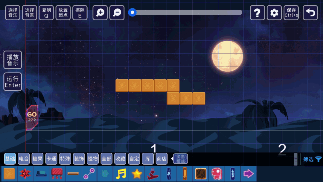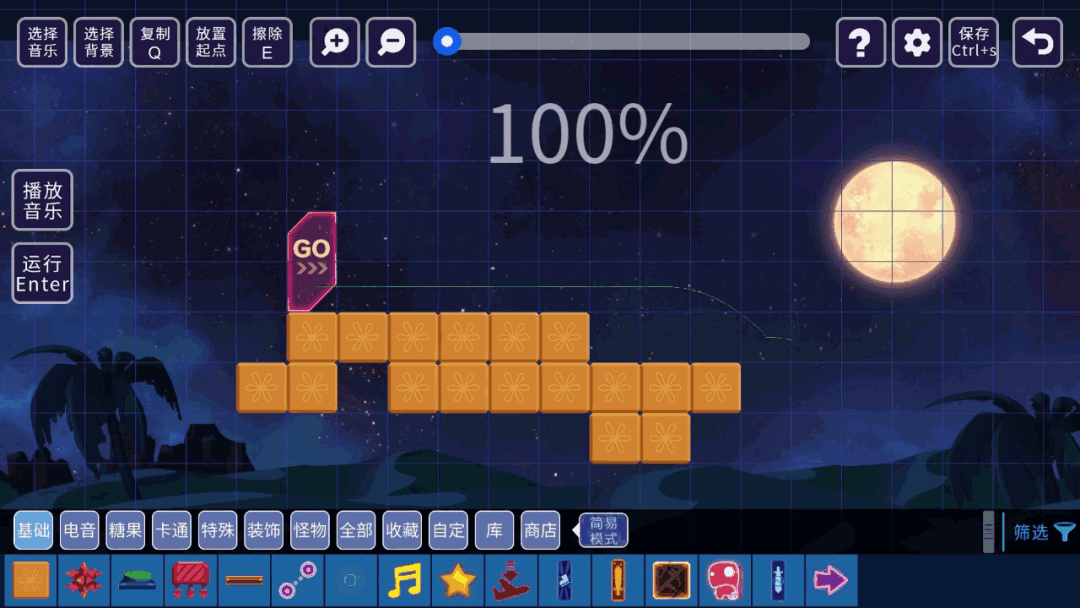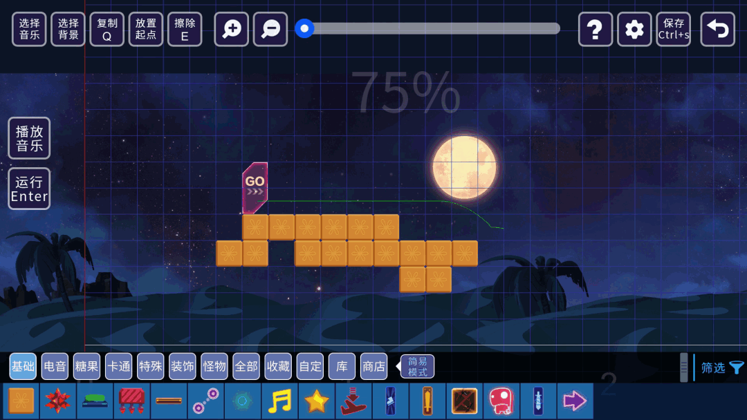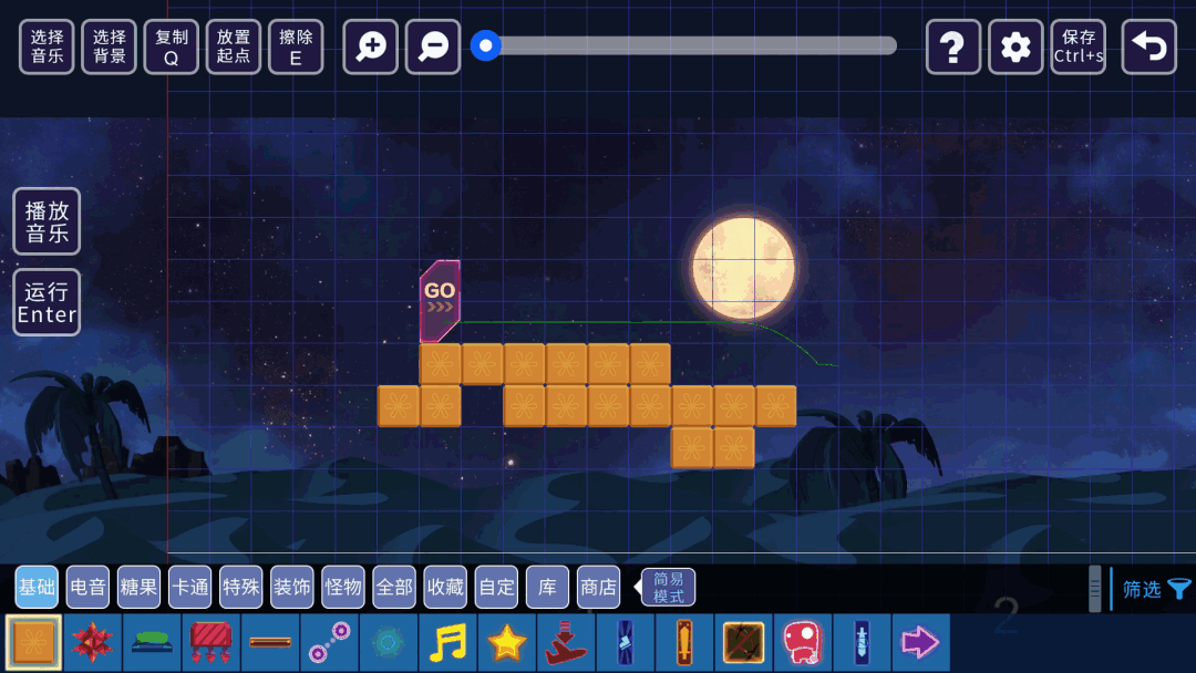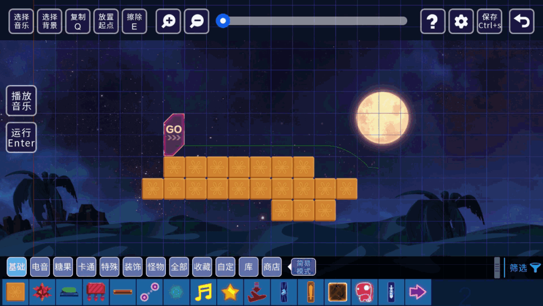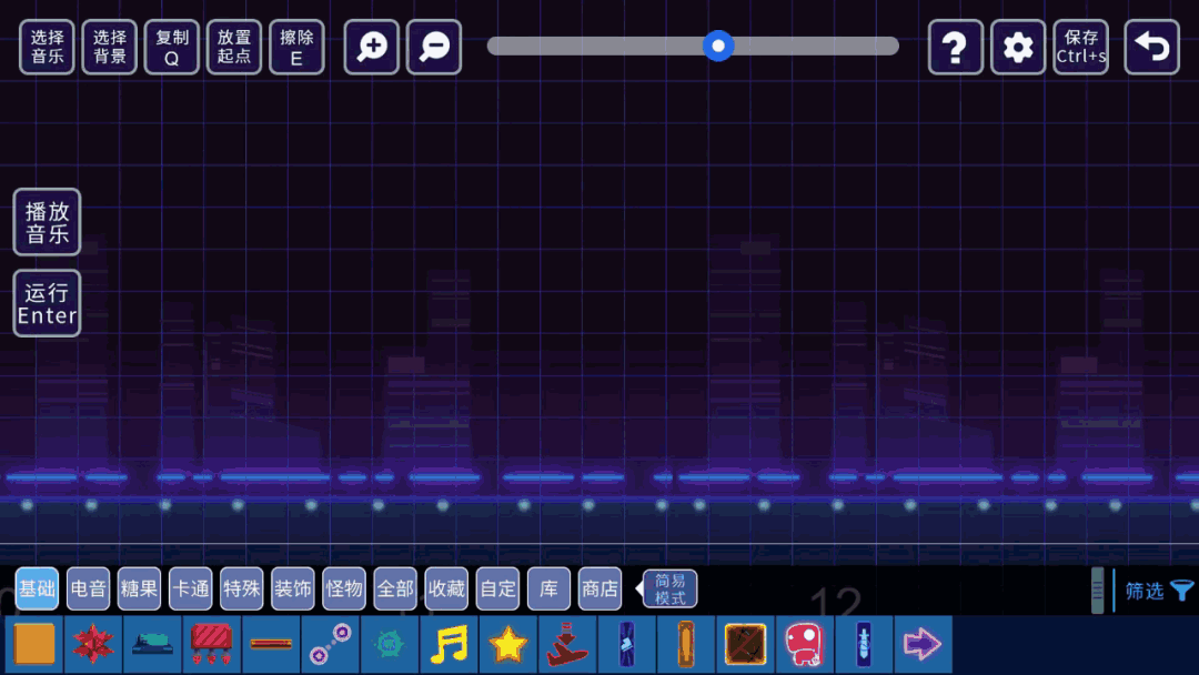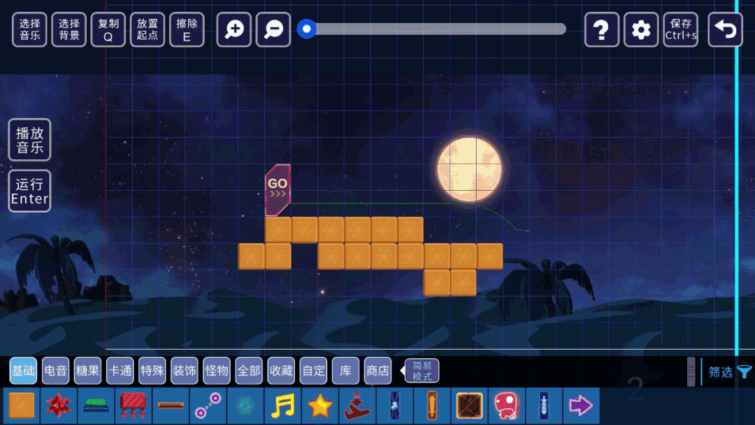 【选择音乐】按钮。给你的关卡挑选合适的音乐。也可以截取音乐的部分段落使用。游戏内提供了一些节奏感很强音乐,乃们还可以使用其他用户的音乐。甚至你还可以上传本地音乐。┏ (^ω^)=☞(得意的叉会腰)